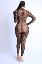 Surprise!! This Spider net printed mesh jumpsuit has web graphic printed mesh fabric. Very sheer and stretchy material that has center front zipper with collar detail and an open knee.